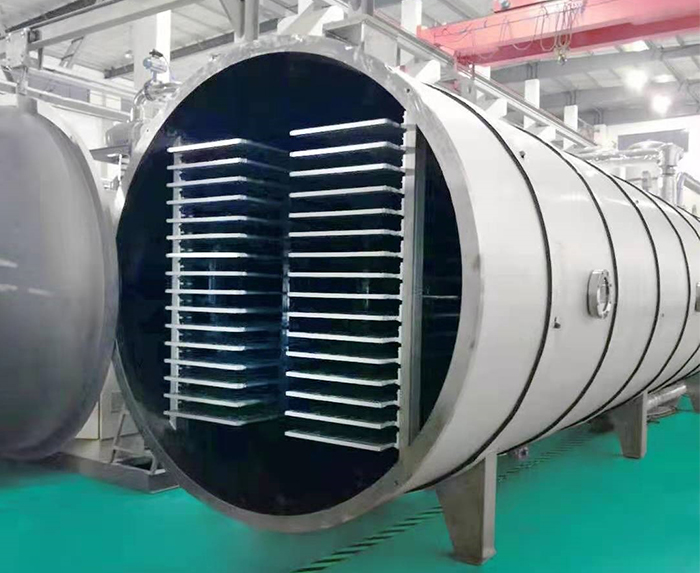 將蔬菜漿置于濃縮器中進行真空濃縮;蔬菜漿濃縮溫度要求在50-65攝氏度之間,進行減壓濃縮;蔬菜漿濃縮方法采用帶攪拌的干燥器;經濃縮的蔬菜漿中,要求固體物含量在35-65%;已經凍結了的蔬菜濃漿進入食品真空冷凍干燥機的凍干室,進行凍干,使其接近共沸點,再抽真空使冰升華。